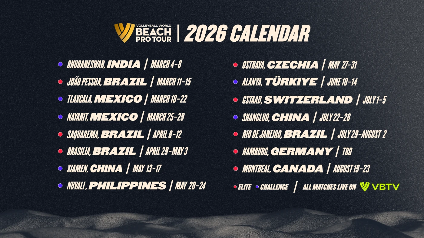 El Tour comenzará en marzo en Bhubaneswar, India, antes de trasladarse a João Pessoa, Brasil, para el primer evento Elite de la temporada. México albergará torneos Challenge consecutivos en Tlaxcala y Nayarit, seguidos por una sólida etapa Elite en Brasil con Saquarema y Brasília. Asia también volverá a recibir eventos Challenge en Xiamen, China, y Nuvali, Filipinas, antes de que el Tour regrese a Europa con paradas en Ostrava, Alanya y el icónico Gstaad, marcando el 26vo año del voleibol profesional de playa en las montañas suizas.